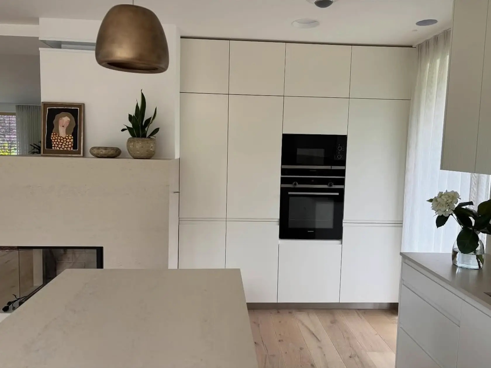 Kuchyňa pokračuje v rovnakom duchu. Čisté línie, biely nábytok a zabudované spotrebiče vytvárajú priestor, ktorý nepôsobí preplnene. Teplé osvetlenie však dodáva miestnosti pocit domova. Nie je to sterilné miesto, ale funkčný priestor, kde sa žije.