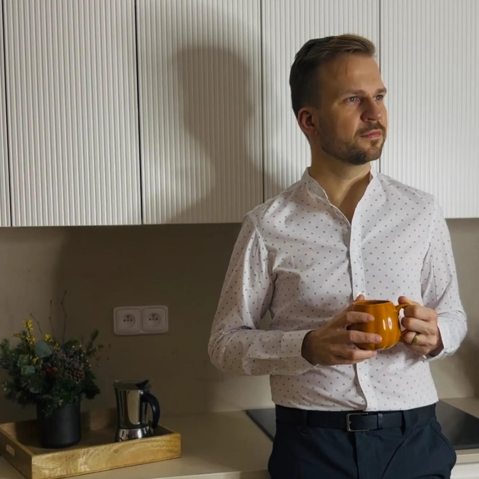 Základom jeho bývania je štýl, ktorý spája japonskú striedmosť a škandinávsku praktickosť. Minimalizmus tu neznamená prázdnotu, ale kontrolu nad priestorom. Svetlé a tmavé drevo sa dopĺňajú, neutrálne farby nechávajú vyniknúť detailom a všetko spolu vytvára pocit, že nič nie je navyše.