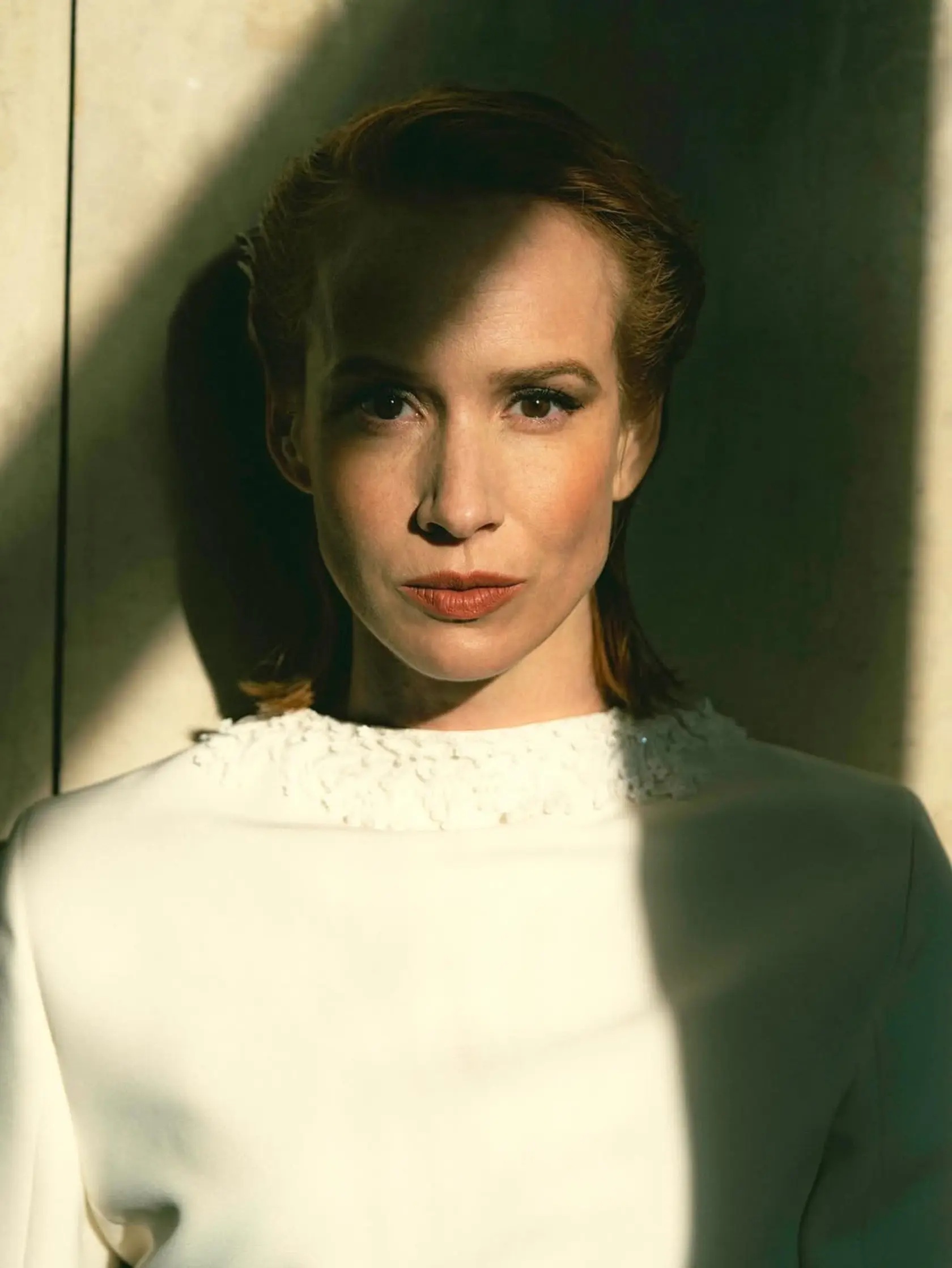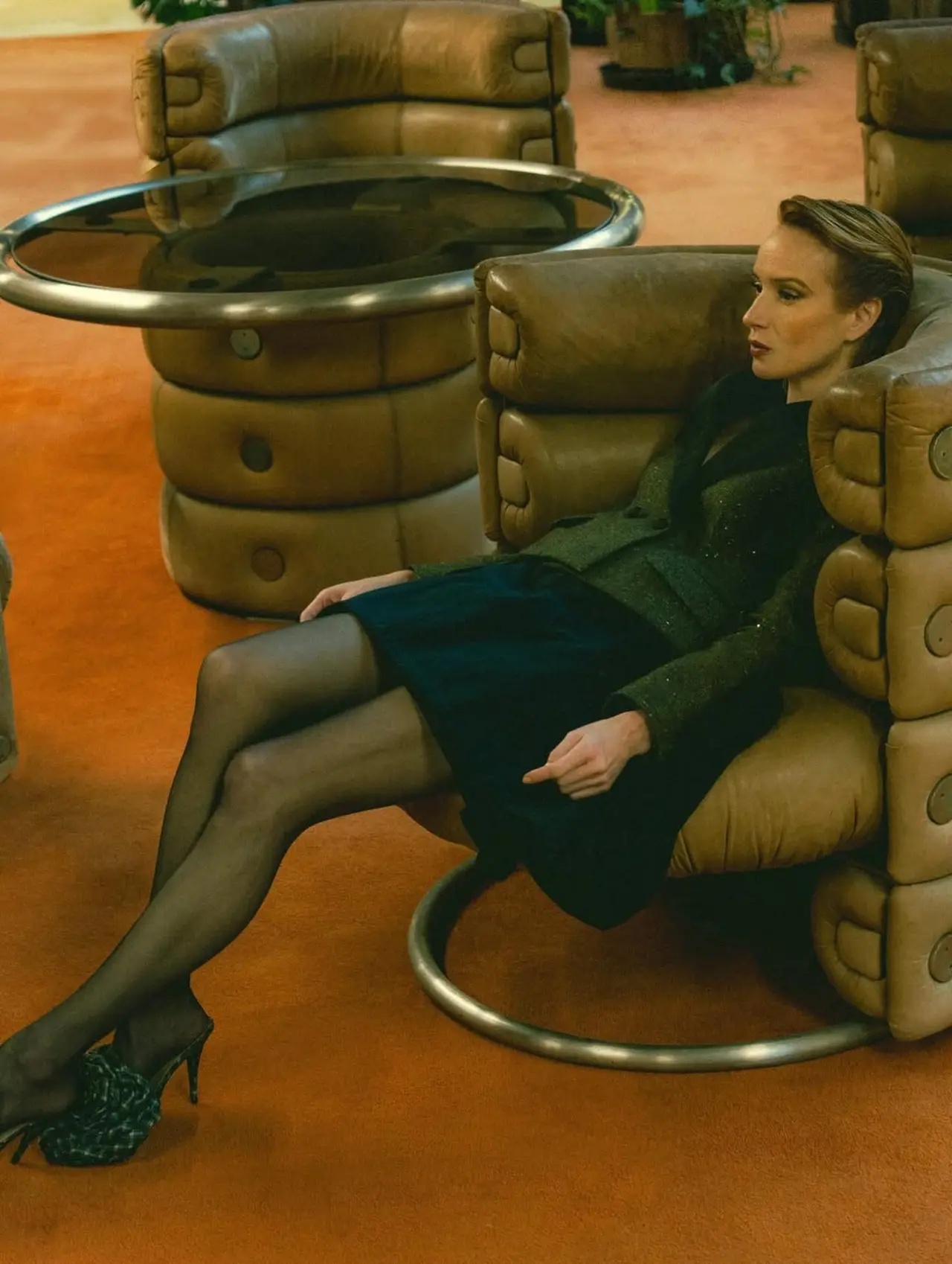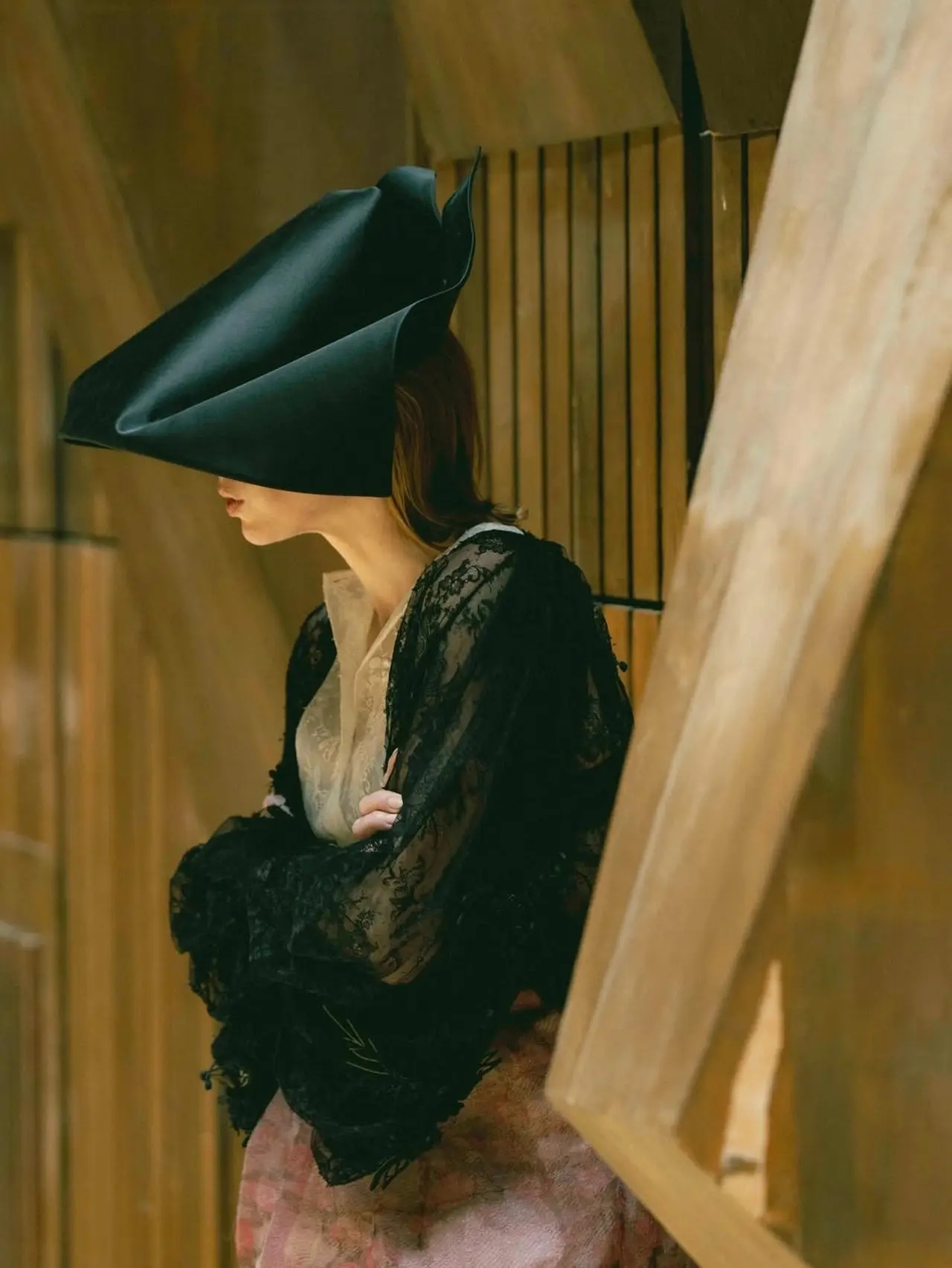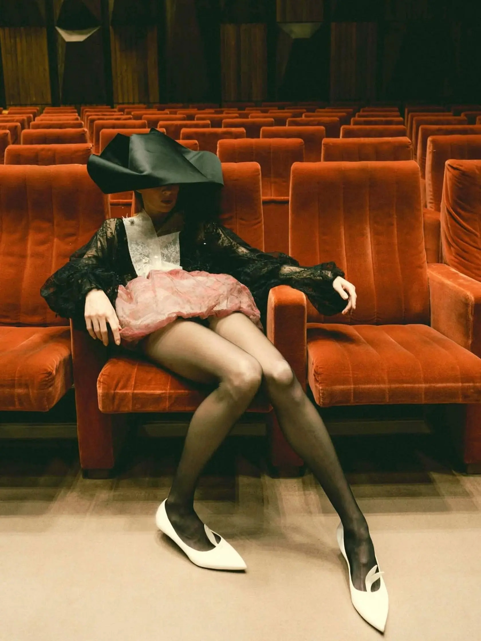 Jedna z fotografií púta pozornosť viac než ostatné. Herečka sedí v sále na výraznom ryšavom kresle. Jej vlasy, typické pre jej imidž, však zakrýva veľký čierny klobúk. Tento detail nepôsobí náhodne. Práve naopak.