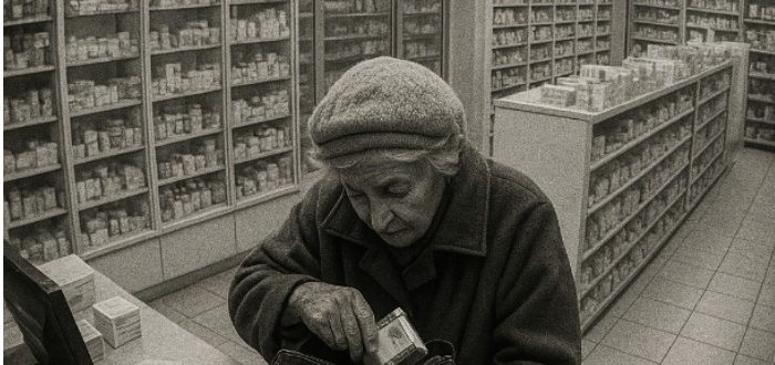 Stará mama dlho stála pri vitríne a zvierala malý papierový zoznam. Zrak jej zlyhával, nohy sa jej triasli, ale stále si pre istotu prečítala názvy. Boli to lieky,